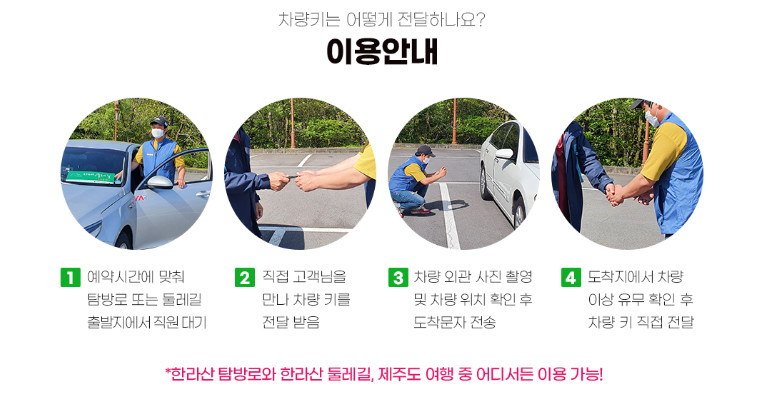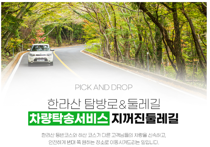 - 차량탁송서비스 - 한라산 탐방로&둘레길과 등하산의 다른 코스의 차량을 반대 방향으로 운전하여 이동해 주는 서비스