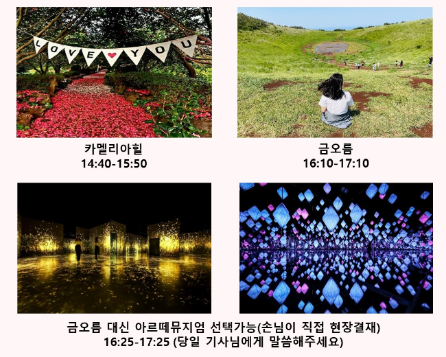 -오전 9시부터 오후 5시(금오름 대신 아르떼 뮤지엄 선택가능 16:25~17:25, 당일 기사님에게 말씀해 주면 됨)