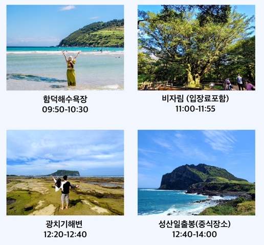 탑승장소 08:30 엠버센트럴호텔 08:35 센트럴시티 호텔 08:45 에어시티 호텔 09:00 제주공항 3층 3번게이트 건너편 버스 승차장 09:15 탑동 팔레스 호텔 하차장소 18:25 동문시장 18:40 제주공항 3층버스 승차장 19:00 글로스터 호텔 19:05 센트럴시티 호텔 19:10 엠버센트럴 호텔 3. 제주도 남쪽 여행코스