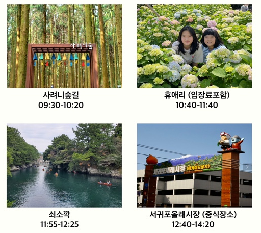 -제주도 남쪽 여행코스는 사려니숲길을 먼저 방문해요. 이어서 휴애리(입장료 포함)를 방문하여 쇠소깍을 방문하고 서귀포 올래시장(중식장소)을 방문합니다. 식사 후 천지연폭포와 더클리프/색달해변을 방문하며 서귀포잠수함(선택가능, 현장결제), 서귀포유람선(선택가능, 현장결제)을 방문합니다. 서귀포잠수함과 서귀포유람선은 천지연폭포 관람대신 이용하시게 돼요.
