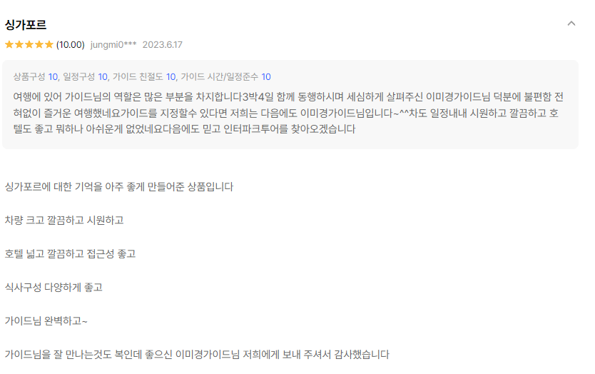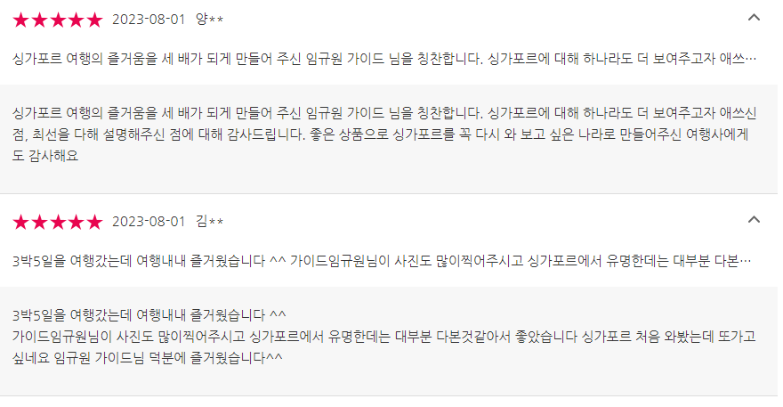 -싱가포르 여행은 날씨로 개인적으로 많은 경험을 했던 곳이기 때문에 기억에 많이 남았던 나라입니다. 실제로 여행을 다녀오신 분들의 후기를 알려드리며 다양한 여행사들의 후기를 각각 모아 놨습니다. 싱가포르 여행하는데 어떤 점이 좋았고 어떤점이 기억에 남았는지 많은 후기를 살펴보며 싱가포르를 여행 일정을 그려보세요.