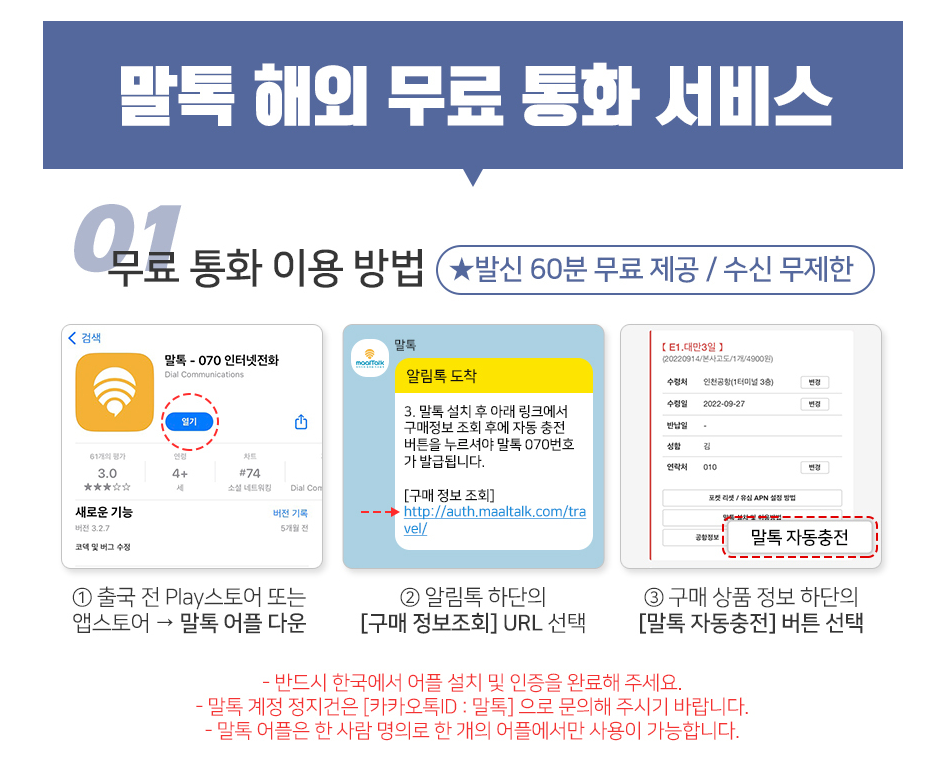 - 말톡 유심은 여행 출국 전 미리 택배로 받아볼수 있고 출국 전, 유심 구매를 깜빡하여도 30분 전 주문시 당일 공항 수령이 가능한 장점이 있습니다. 수령도 인천공항 1,2 터미널에서도 받아보실 수 있어 편리합니다. 또한 발신 60분 무료 제공인 장점이 있으니 전화를 하셔야 되는 여행자라면 필수 추천 드립니다.